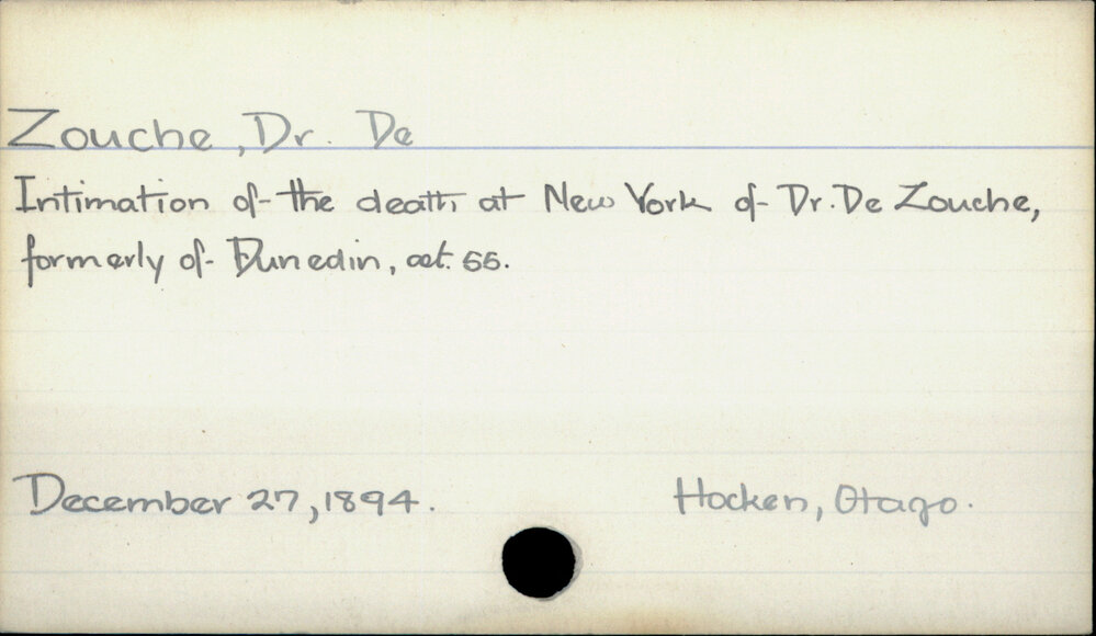 Dunedin Public Libraries (3rd Aug 2023). Zouche, Dr De. In Website Dunedin Public Libraries. Retrieved 16th Apr 2026 09:19, from https://dunedin.recollect.co.nz/nodes/view/101999