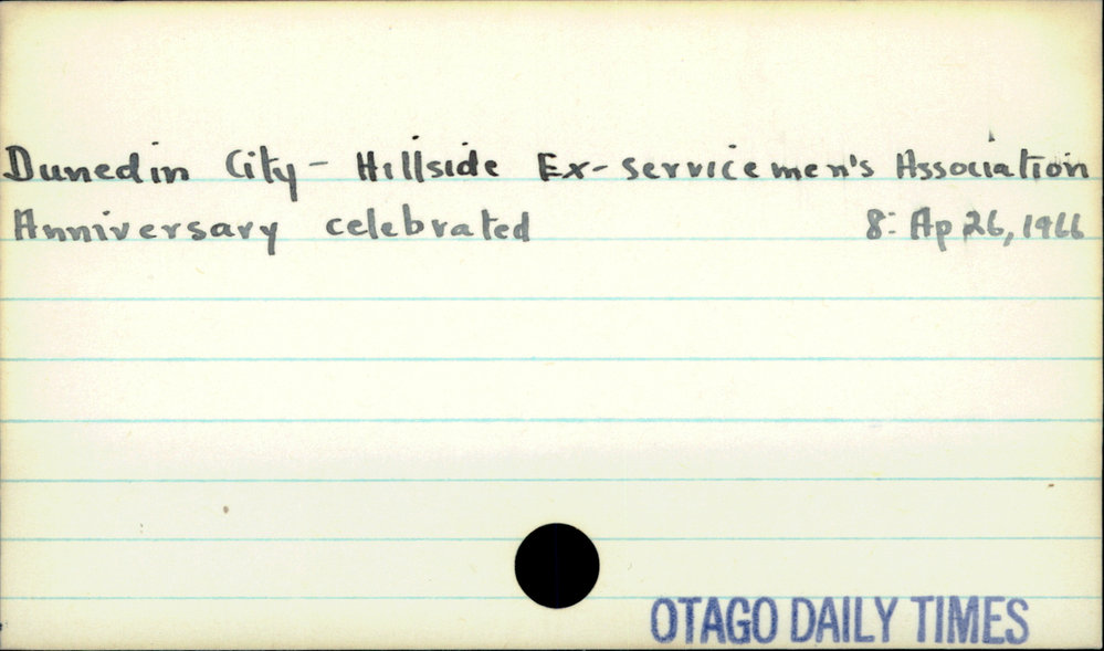 Dunedin Public Libraries (13th Feb 2017). Dunedin City - Hillside Ex-servicemen's Association. In Website Dunedin Public Libraries. Retrieved 5th Apr 2026 07:43, from https://dunedin.recollect.co.nz/nodes/view/102898