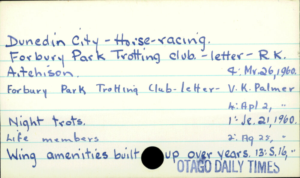 Dunedin Public Libraries (12th Mar 2017). Dunedin City - Horse-racing. In Website Dunedin Public Libraries. Retrieved 14th Apr 2026 00:16, from https://dunedin.recollect.co.nz/nodes/view/103340