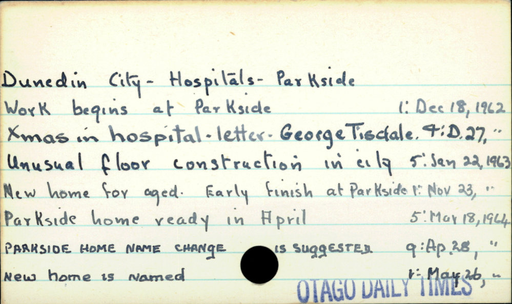 Dunedin Public Libraries (4th Mar 2017). Dunedin City - Hospitals - Parkside. In Website Dunedin Public Libraries. Retrieved 2nd Apr 2026 21:50, from https://dunedin.recollect.co.nz/nodes/view/103780