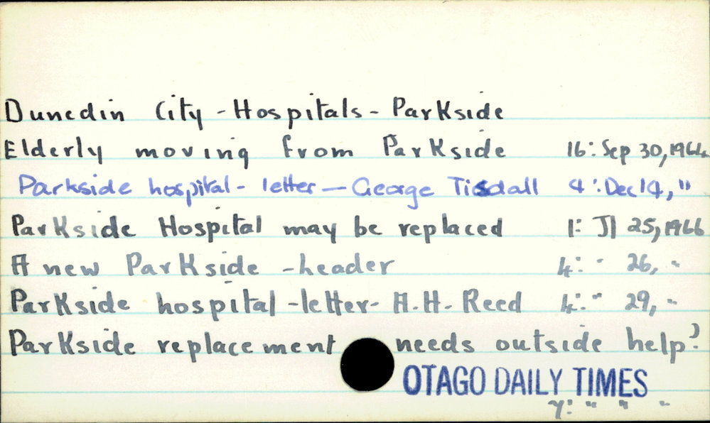 Dunedin Public Libraries (4th Mar 2017). Dunedin City - Hospitals - Parkside. In Website Dunedin Public Libraries. Retrieved 2nd Apr 2026 21:44, from https://dunedin.recollect.co.nz/nodes/view/103781