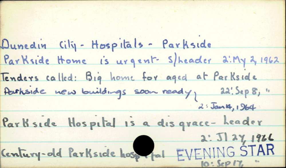 Dunedin Public Libraries (4th Mar 2017). Dunedin City - Hospitals - Parkside. In Website Dunedin Public Libraries. Retrieved 2nd Apr 2026 21:44, from https://dunedin.recollect.co.nz/nodes/view/103782
