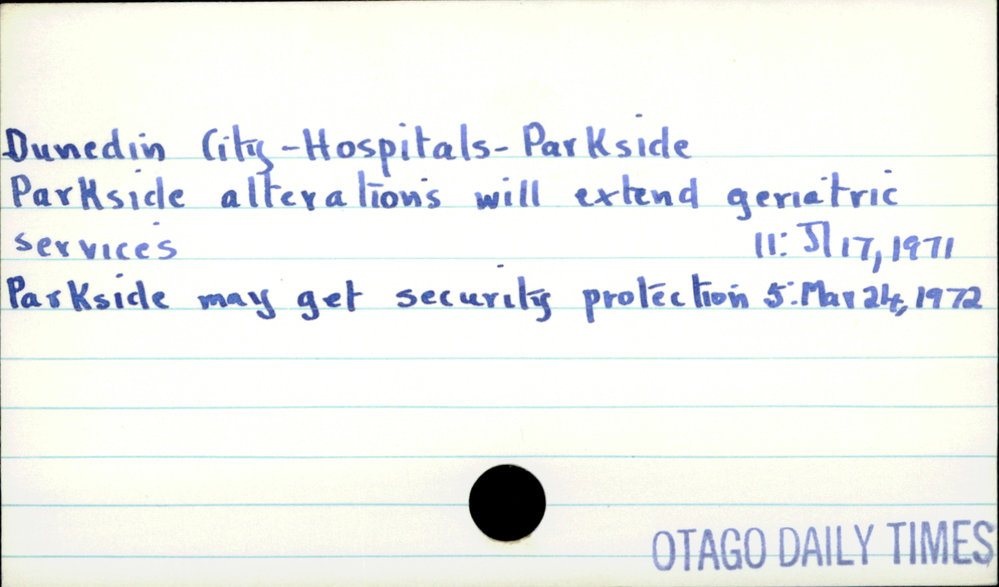 Dunedin Public Libraries (4th Mar 2017). Dunedin City - Hospitals - Parkside. In Website Dunedin Public Libraries. Retrieved 2nd Apr 2026 21:41, from https://dunedin.recollect.co.nz/nodes/view/103786