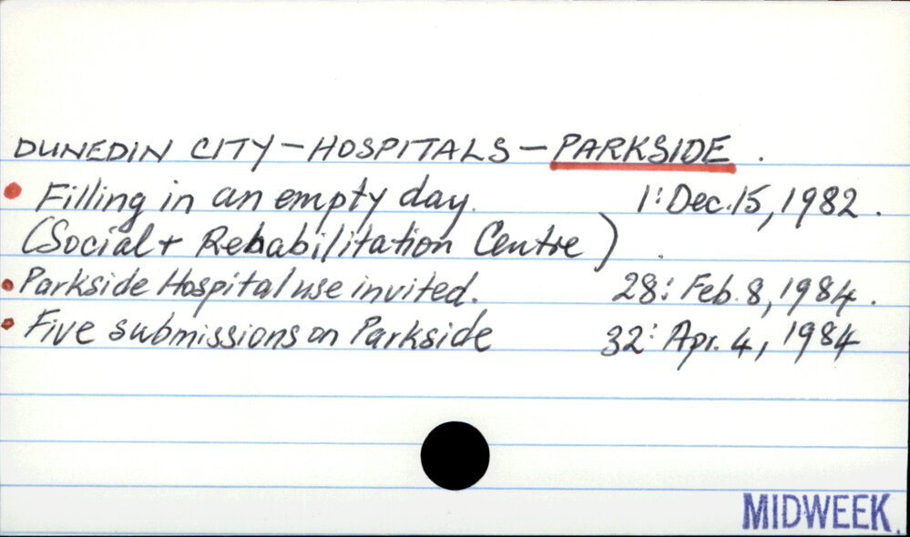 Dunedin Public Libraries (4th Mar 2017). DUNEDIN CITY - HOSPITALS - PARKSIDE.. In Website Dunedin Public Libraries. Retrieved 2nd Apr 2026 21:42, from https://dunedin.recollect.co.nz/nodes/view/103789