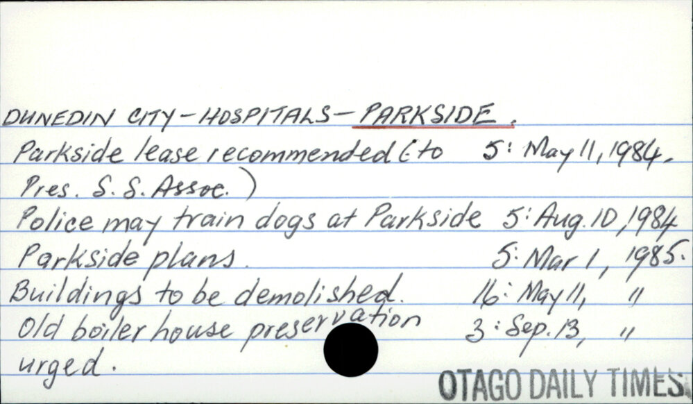 Dunedin Public Libraries (4th Mar 2017). DUNEDIN CITY - HOSPITALS- PARKSIDE.. In Website Dunedin Public Libraries. Retrieved 2nd Apr 2026 21:43, from https://dunedin.recollect.co.nz/nodes/view/103792
