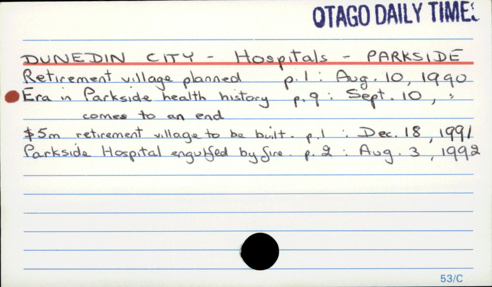 Dunedin Public Libraries (4th Mar 2017). DUNEDIN CITY - Hospitals - PARKSIDE. In Website Dunedin Public Libraries. Retrieved 2nd Apr 2026 21:44, from https://dunedin.recollect.co.nz/nodes/view/103794