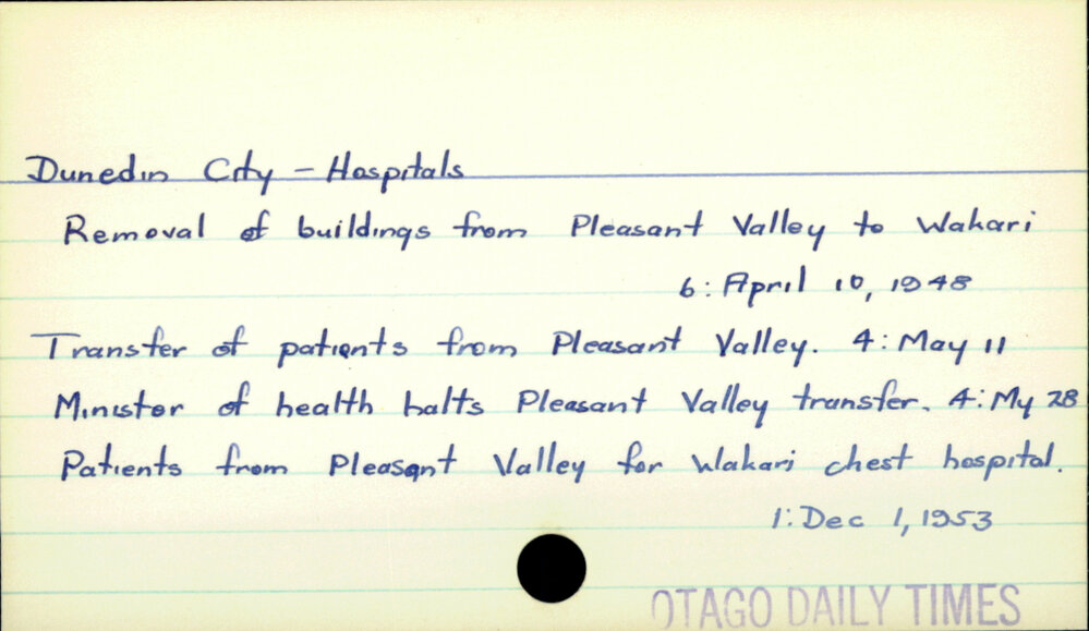 Dunedin Public Libraries (5th Mar 2017). Dunedin City - Hospitals. In Website Dunedin Public Libraries. Retrieved 2nd Apr 2026 21:50, from https://dunedin.recollect.co.nz/nodes/view/103796