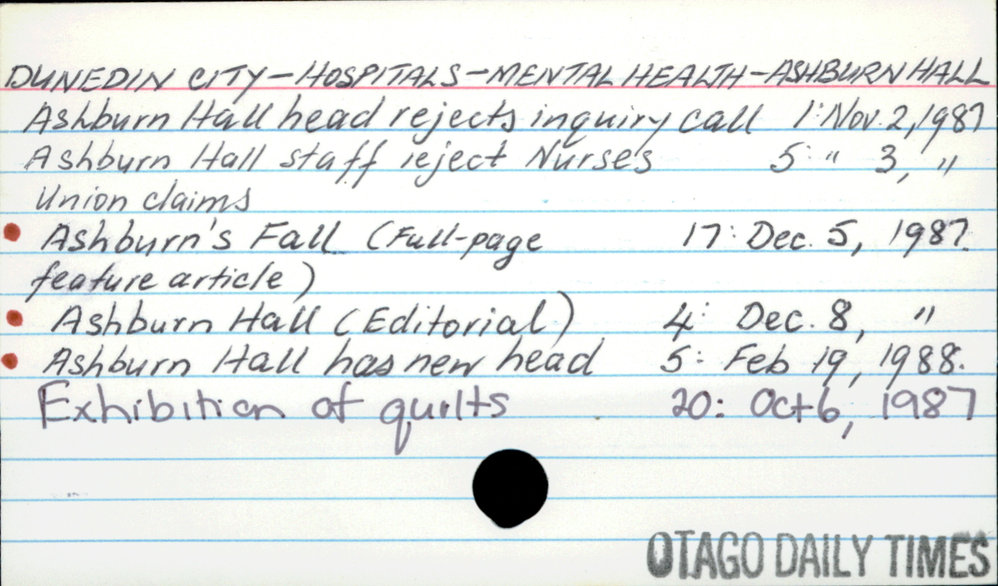 Dunedin Public Libraries (22nd Mar 2017). Dunedin City - Hospitals - Mental health - Ashburn Hall. In Website Dunedin Public Libraries. Retrieved 1st May 2026 03:02, from https://dunedin.recollect.co.nz/nodes/view/104394