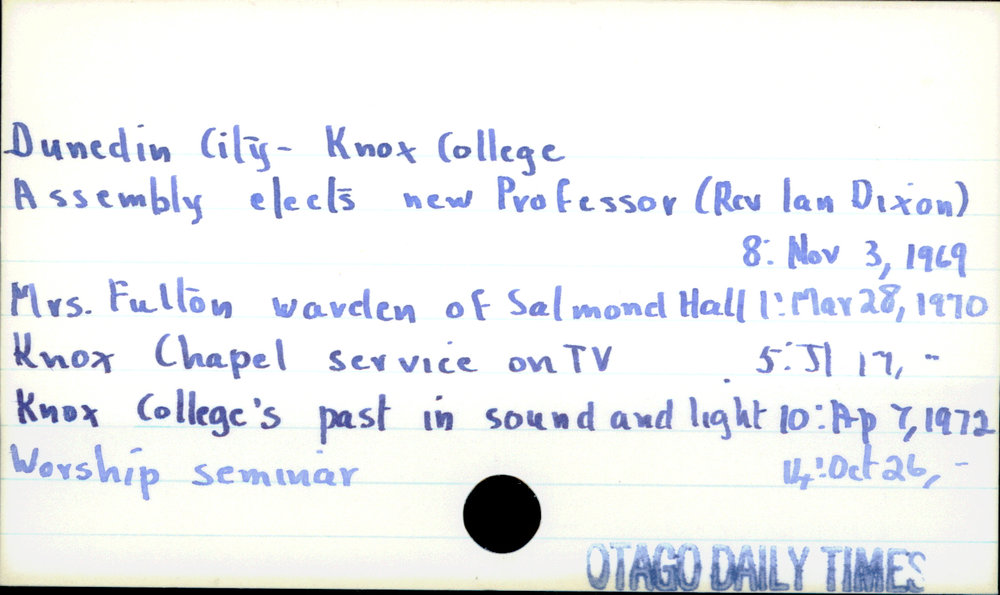 Dunedin Public Libraries (3rd Apr 2017). Dunedin City - Knox College. In Website Dunedin Public Libraries. Retrieved 4th Apr 2026 01:10, from https://dunedin.recollect.co.nz/nodes/view/105563