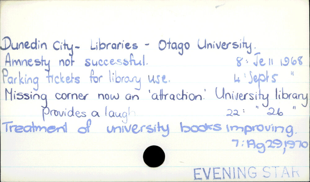 Dunedin Public Libraries (27th Apr 2017). Dunedin City - Libraries - Otago University. . In Website Dunedin Public Libraries. Retrieved 2nd Apr 2026 17:45, from https://dunedin.recollect.co.nz/nodes/view/106342
