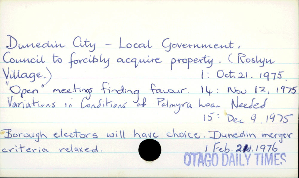 Dunedin Public Libraries (6th May 2017). Dunedin City - Local Government. . In Website Dunedin Public Libraries. Retrieved 2nd Apr 2026 14:10, from https://dunedin.recollect.co.nz/nodes/view/107286