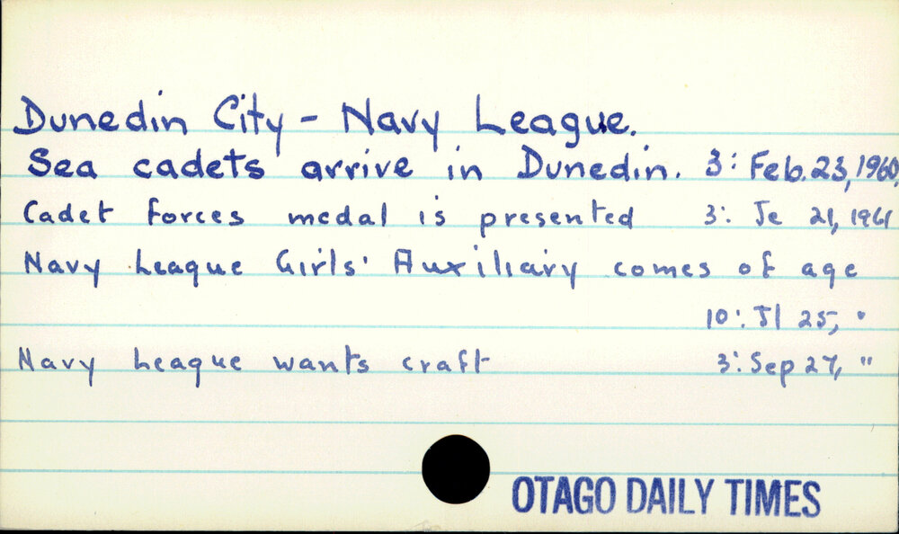 Dunedin Public Libraries (16th Jun 2017). Dunedin City-Navy League. In Website Dunedin Public Libraries. Retrieved 4th Apr 2026 21:02, from https://dunedin.recollect.co.nz/nodes/view/109996