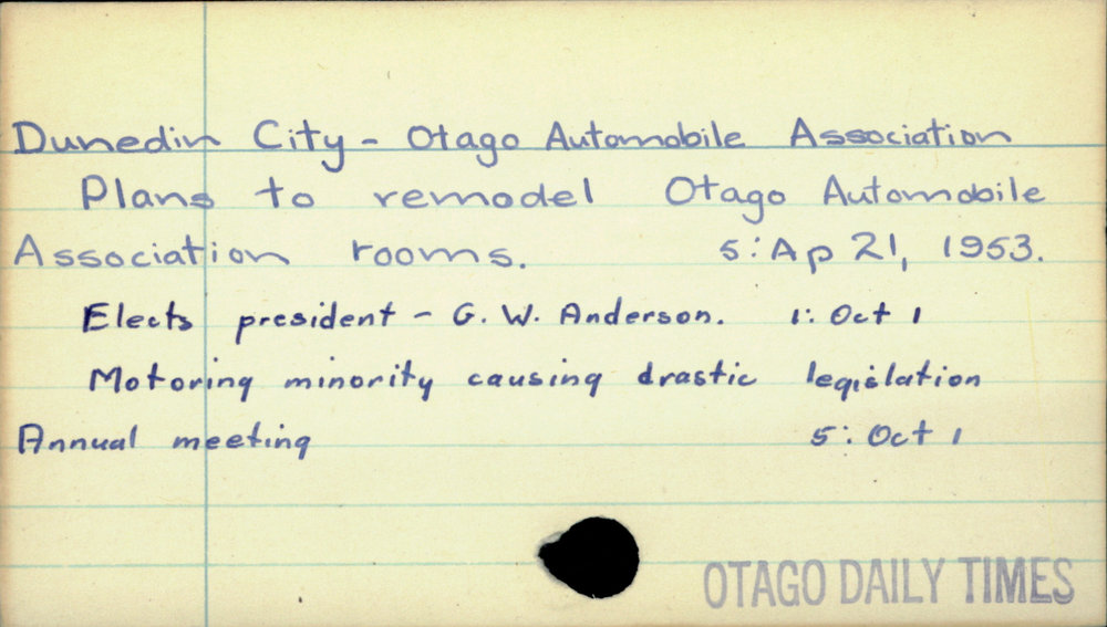 Dunedin Public Libraries (3rd Jul 2017). Dunedin City - Otago Automobile Association . In Website Dunedin Public Libraries. Retrieved 2nd Apr 2026 17:46, from https://dunedin.recollect.co.nz/nodes/view/110912