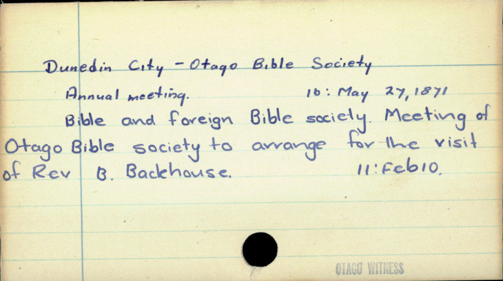 Dunedin Public Libraries (23rd Jun 2017). Dunedin City - Otago Bible Society. In Website Dunedin Public Libraries. Retrieved 2nd Apr 2026 17:46, from https://dunedin.recollect.co.nz/nodes/view/110917