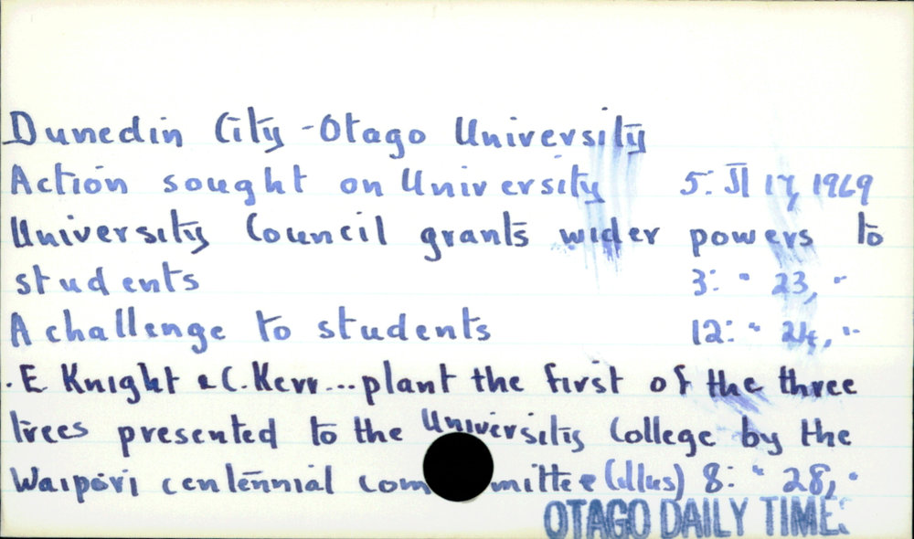 Dunedin Public Libraries (17th Jul 2017). Dunedin City- Otago University . In Website Dunedin Public Libraries. Retrieved 27th Mar 2026 18:11, from https://dunedin.recollect.co.nz/nodes/view/111853