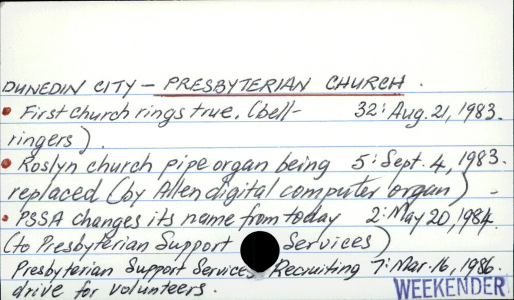 Dunedin Public Libraries (22nd Aug 2017). DUNEDIN CITY - PRESBYTERIAN CHURCH. In Website Dunedin Public Libraries. Retrieved 27th Mar 2026 10:37, from https://dunedin.recollect.co.nz/nodes/view/113539
