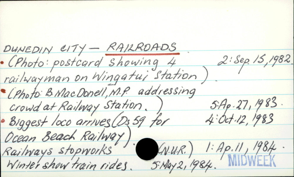 Dunedin Public Libraries (3rd Sep 2017). Dunedin City - Railroads. In Website Dunedin Public Libraries. Retrieved 27th Mar 2026 10:37, from https://dunedin.recollect.co.nz/nodes/view/114420