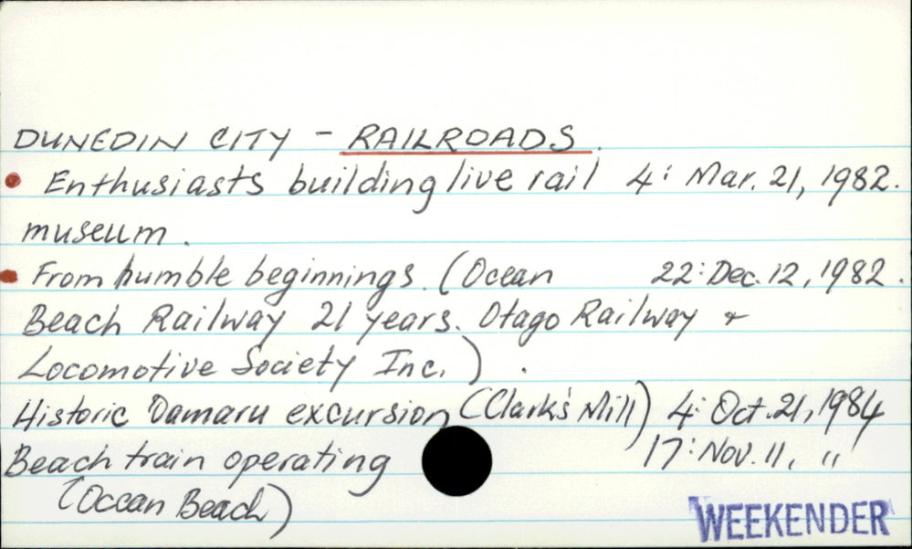 Dunedin Public Libraries (1st Sep 2017). DUNEDIN CITY - RAILROADS.. In Website Dunedin Public Libraries. Retrieved 27th Mar 2026 10:36, from https://dunedin.recollect.co.nz/nodes/view/114421