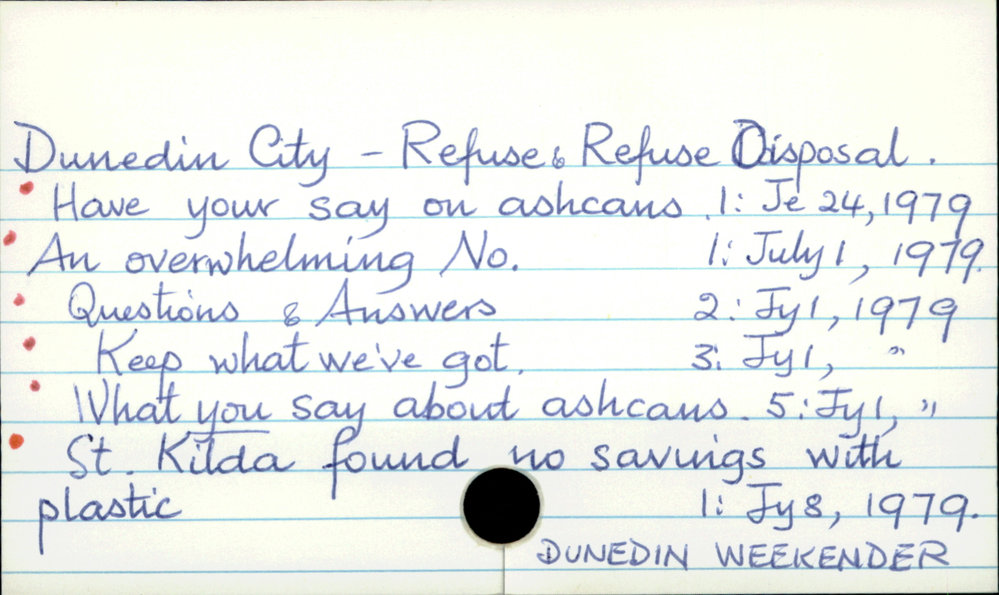 Dunedin Public Libraries (20th Sep 2017). Dunedin City - Refuse and refuse disposal. In Website Dunedin Public Libraries. Retrieved 2nd Apr 2026 15:53, from https://dunedin.recollect.co.nz/nodes/view/114930
