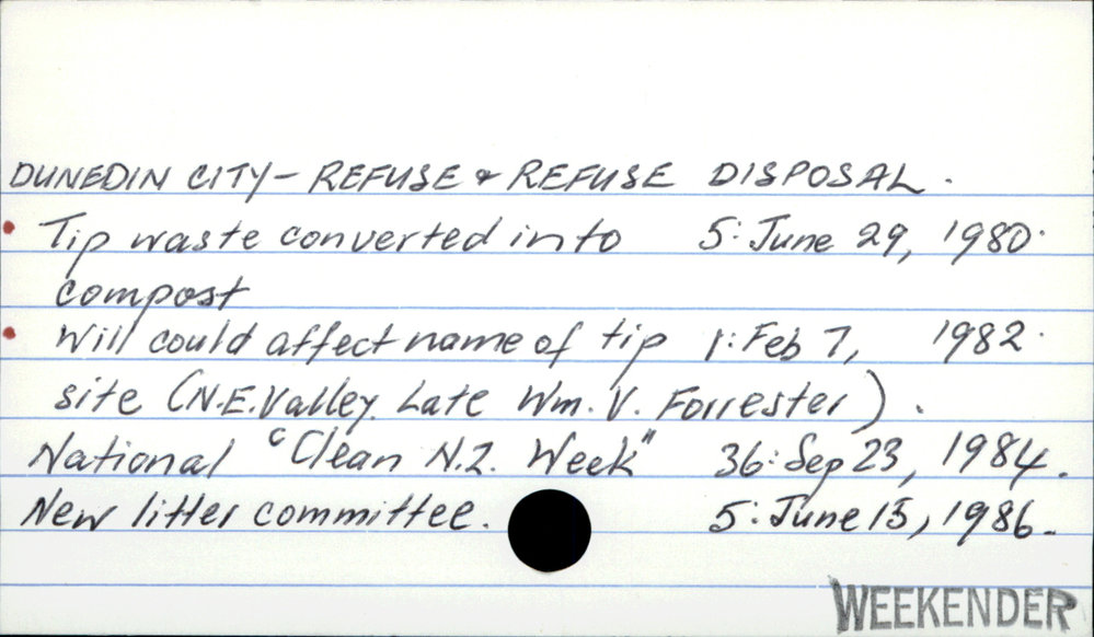 Dunedin Public Libraries (20th Sep 2017). Dunedin City - Refuse and refuse disposal. In Website Dunedin Public Libraries. Retrieved 2nd Apr 2026 15:47, from https://dunedin.recollect.co.nz/nodes/view/114941