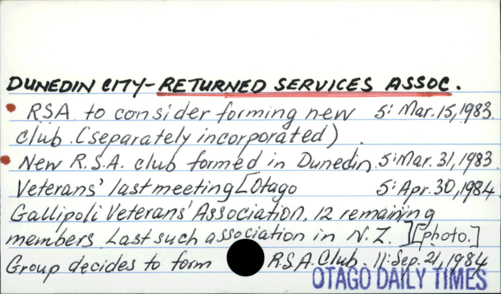 Dunedin Public Libraries (18th Sep 2017). Dunedin City - Returned Services Association. In Website Dunedin Public Libraries. Retrieved 27th Mar 2026 10:35, from https://dunedin.recollect.co.nz/nodes/view/115318