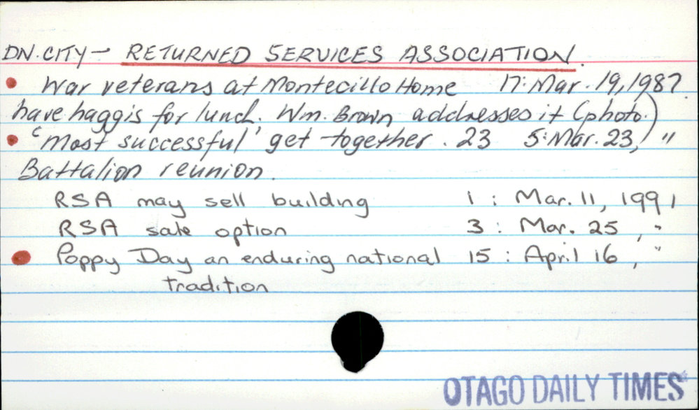 Dunedin Public Libraries (18th Sep 2017). Dunedin City - Returned Services Association. In Website Dunedin Public Libraries. Retrieved 27th Mar 2026 10:28, from https://dunedin.recollect.co.nz/nodes/view/115321