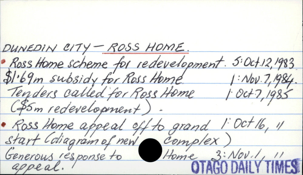 Dunedin Public Libraries (10th Oct 2017). DUNEDIN CITY - ROSS HOME.. In Website Dunedin Public Libraries. Retrieved 27th Mar 2026 00:32, from https://dunedin.recollect.co.nz/nodes/view/116239