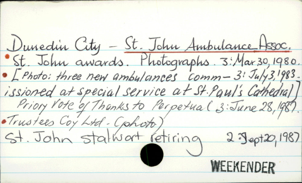 Dunedin Public Libraries (30th Nov 2017). Dunedin City - St John Ambulance Association and Brigade. In Website Dunedin Public Libraries. Retrieved 2nd Apr 2026 15:50, from https://dunedin.recollect.co.nz/nodes/view/116577
