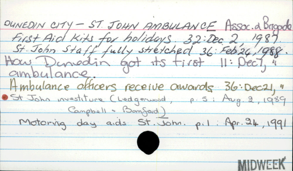 Dunedin Public Libraries (30th Nov 2017). Dunedin City - St John Amblulance Association and Brighade. In Website Dunedin Public Libraries. Retrieved 2nd Apr 2026 12:26, from https://dunedin.recollect.co.nz/nodes/view/116579