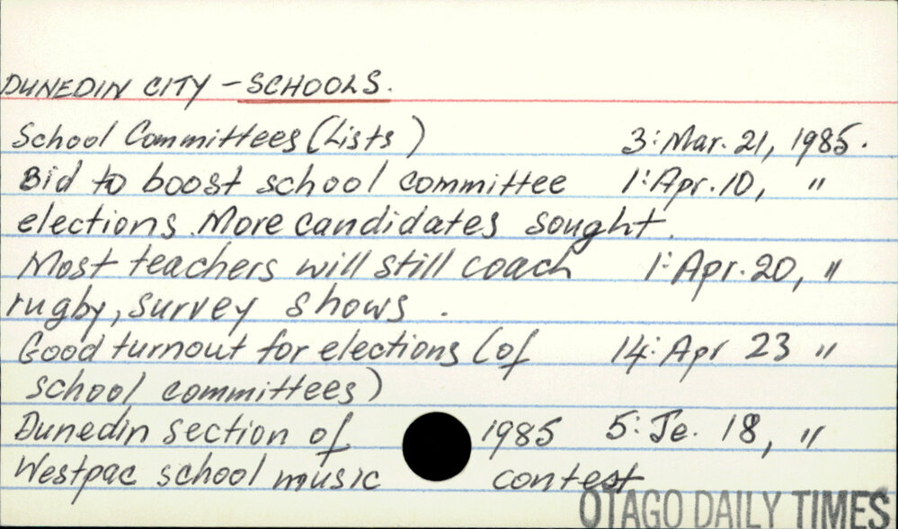 Dunedin Public Libraries (11th Nov 2017). DUNEDIN CITY - SCHOOLS.. In Website Dunedin Public Libraries. Retrieved 27th Mar 2026 15:08, from https://dunedin.recollect.co.nz/nodes/view/117135