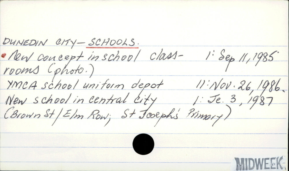 Dunedin Public Libraries (11th Nov 2017). DUNEDIN CITY - SCHOOLS.. In Website Dunedin Public Libraries. Retrieved 27th Mar 2026 15:08, from https://dunedin.recollect.co.nz/nodes/view/117137