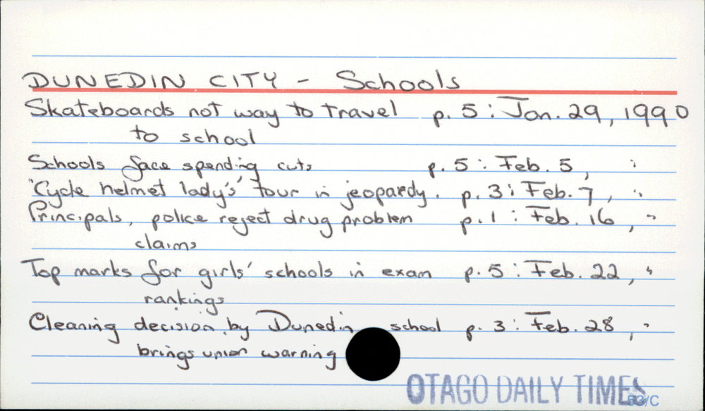 Dunedin Public Libraries (10th Nov 2017). DUNEDIN CITY - Schools. In Website Dunedin Public Libraries. Retrieved 27th Mar 2026 15:12, from https://dunedin.recollect.co.nz/nodes/view/117145