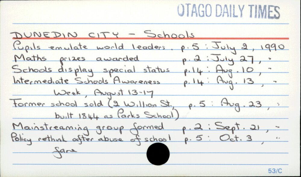 Dunedin Public Libraries (12th Nov 2017). Dunedin City - Schools. In Website Dunedin Public Libraries. Retrieved 27th Mar 2026 15:12, from https://dunedin.recollect.co.nz/nodes/view/117147