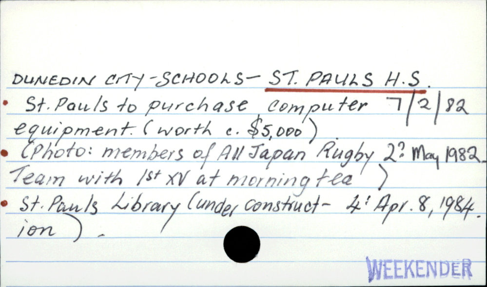 Dunedin Public Libraries (30th Nov 2017). Dunedin City - Schools - St Pauls High School. In Website Dunedin Public Libraries. Retrieved 2nd Apr 2026 15:47, from https://dunedin.recollect.co.nz/nodes/view/118750