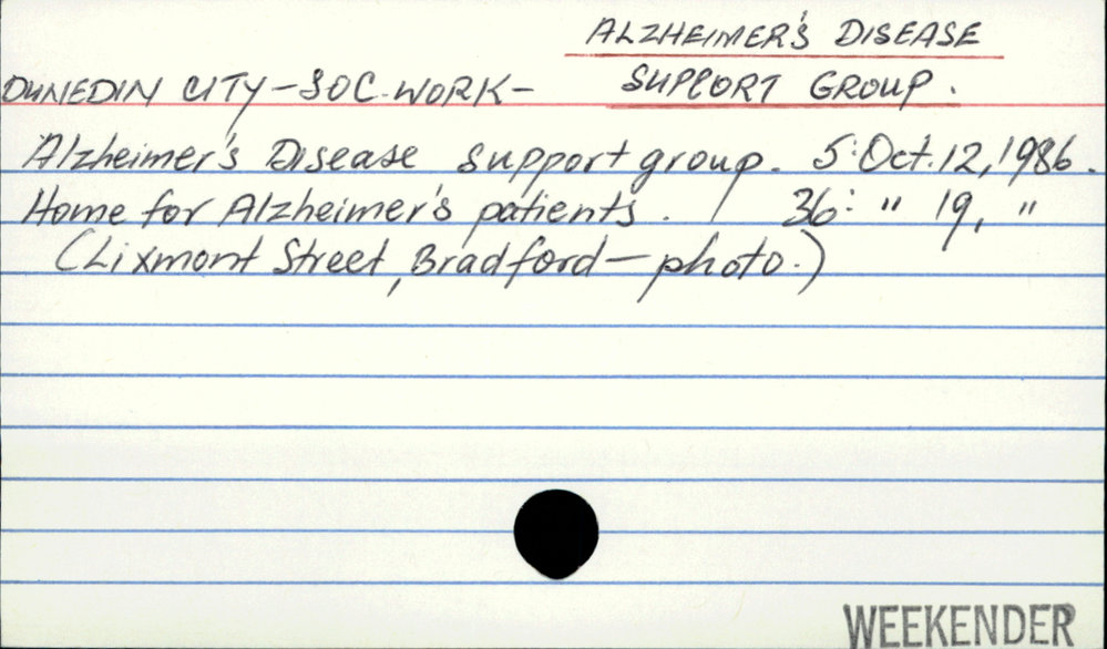 Dunedin Public Libraries (26th Jan 2018). Dunedin City - Social Work - Alzheimers Disease Support Group. In Website Dunedin Public Libraries. Retrieved 2nd Apr 2026 15:53, from https://dunedin.recollect.co.nz/nodes/view/119801