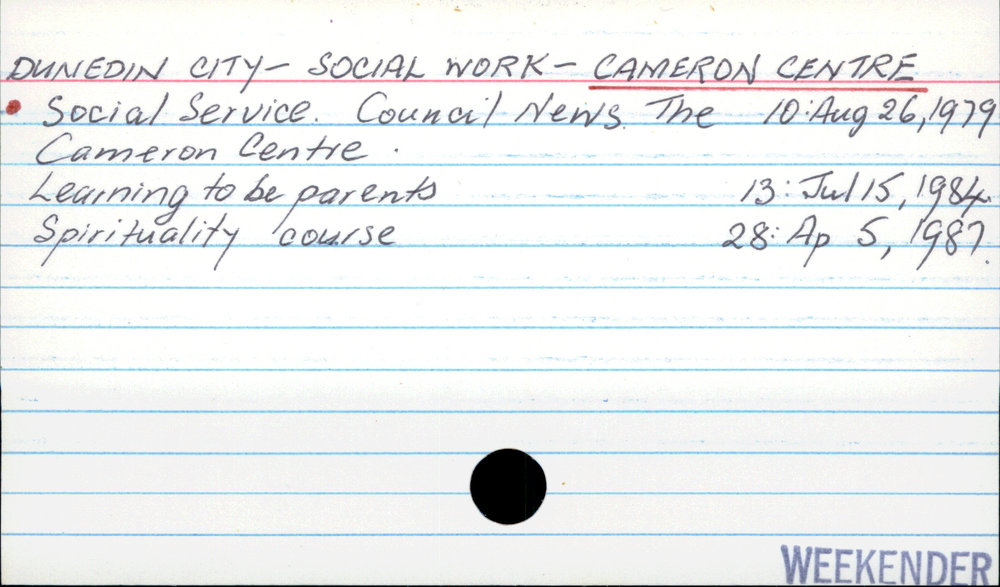 Dunedin Public Libraries (26th Jan 2018). Dunedin City - Social Work - Cameron Centre. In Website Dunedin Public Libraries. Retrieved 2nd Apr 2026 15:53, from https://dunedin.recollect.co.nz/nodes/view/119814
