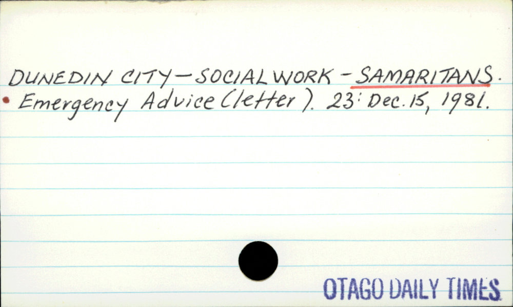 Dunedin Public Libraries (21st Jan 2018). Dunedin City - Social Work - Samaritans. In Website Dunedin Public Libraries. Retrieved 27th Mar 2026 10:35, from https://dunedin.recollect.co.nz/nodes/view/119903