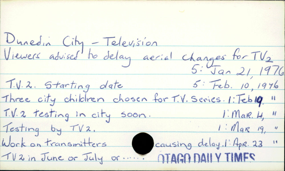 Dunedin Public Libraries (28th Dec 2017). Dunedin City - Television . In Website Dunedin Public Libraries. Retrieved 27th Mar 2026 10:48, from https://dunedin.recollect.co.nz/nodes/view/120809