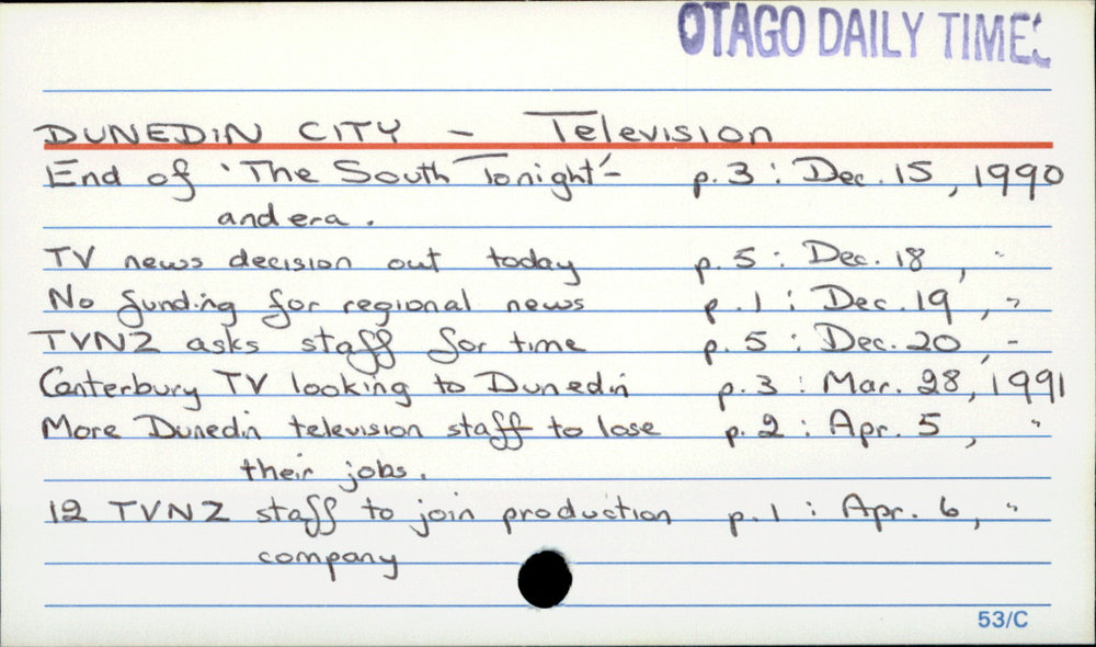 Dunedin Public Libraries (11th Feb 2018). DUNEDIN CITY - Television. In Website Dunedin Public Libraries. Retrieved 27th Mar 2026 10:49, from https://dunedin.recollect.co.nz/nodes/view/120826