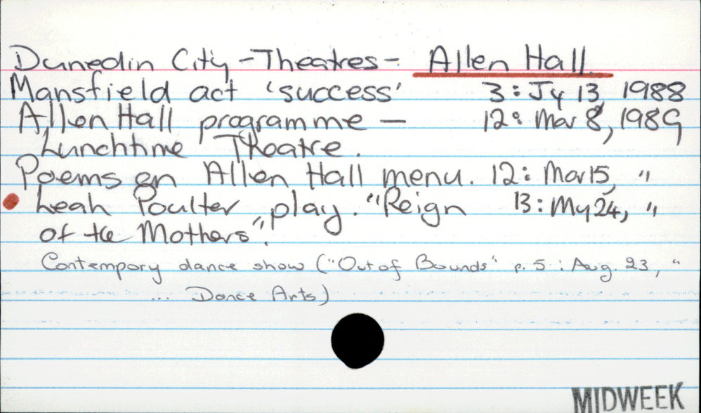 Dunedin Public Libraries (25th Feb 2018). Dunedin City - Theatres - Allen Hall. In Website Dunedin Public Libraries. Retrieved 22nd Apr 2026 03:10, from https://dunedin.recollect.co.nz/nodes/view/121474
