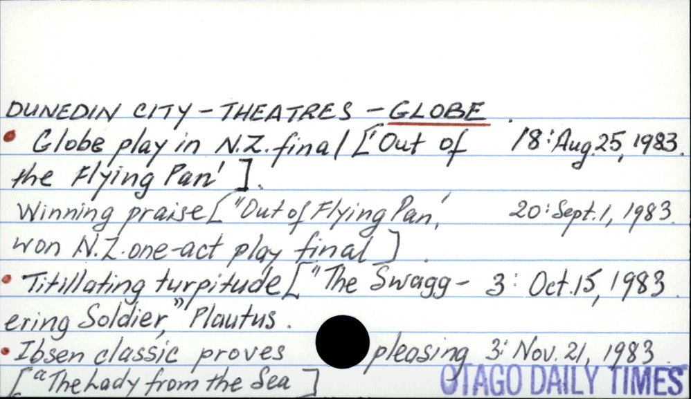 Dunedin Public Libraries (19th Feb 2018). DUNEDIN CITY - THEATRES - GLOBE . In Website Dunedin Public Libraries. Retrieved 27th Mar 2026 10:37, from https://dunedin.recollect.co.nz/nodes/view/121684
