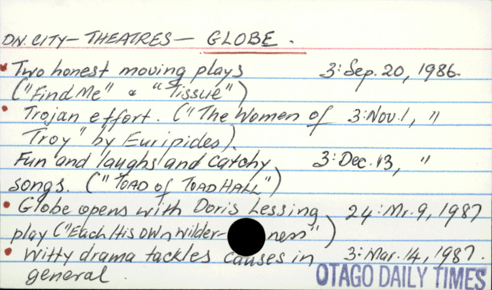 Dunedin Public Libraries (11th Mar 2018). DUNEDIN CITY - THEATRES - GLOBE . In Website Dunedin Public Libraries. Retrieved 27th Mar 2026 10:37, from https://dunedin.recollect.co.nz/nodes/view/121690