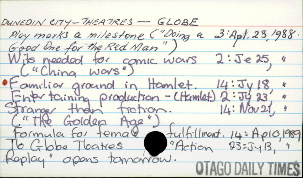 Dunedin Public Libraries (9th Mar 2018). Dunedin City - Theatres - Globe. In Website Dunedin Public Libraries. Retrieved 27th Mar 2026 10:37, from https://dunedin.recollect.co.nz/nodes/view/121696