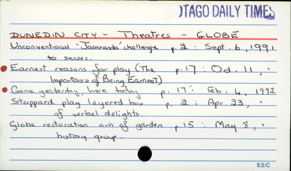 Dunedin Public Libraries (19th Feb 2018). Dunedin City - Theatres - Globe. In Website Dunedin Public Libraries. Retrieved 27th Mar 2026 10:35, from https://dunedin.recollect.co.nz/nodes/view/121700