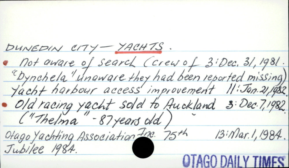 Dunedin Public Libraries (18th Apr 2018). Dunedin City - Yachts . In Website Dunedin Public Libraries. Retrieved 27th Mar 2026 10:28, from https://dunedin.recollect.co.nz/nodes/view/124406