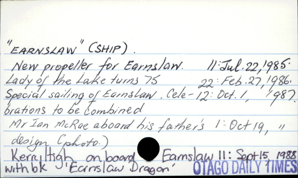 Dunedin Public Libraries (4th May 2018). "EARNSLAW" (SHIP). In Website Dunedin Public Libraries. Retrieved 27th Mar 2026 14:19, from https://dunedin.recollect.co.nz/nodes/view/125365