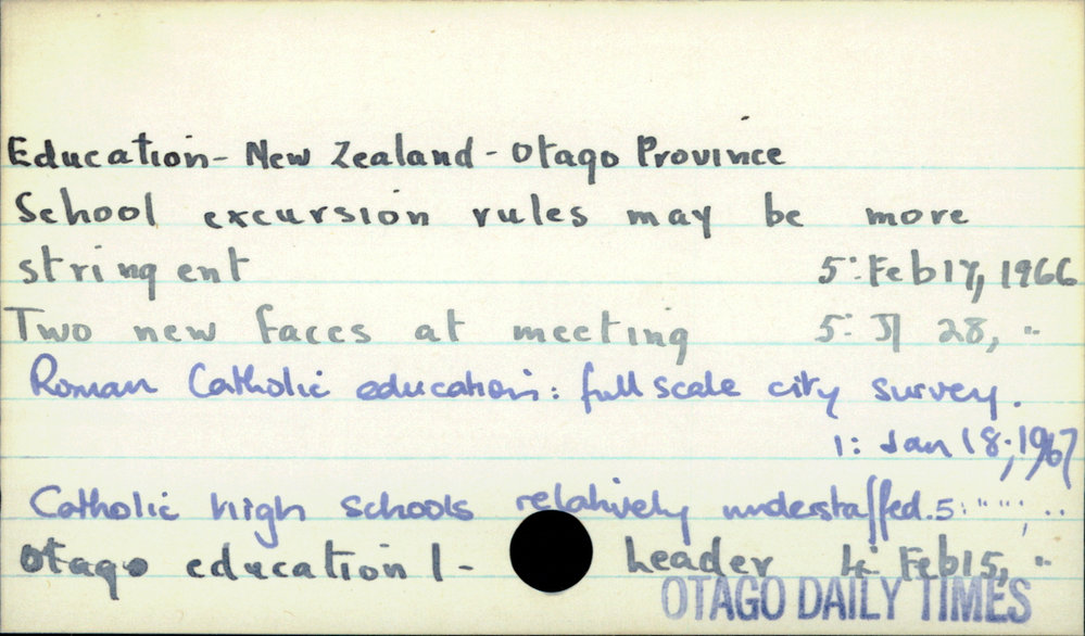 Dunedin Public Libraries (4th Oct 2019). Education - New Zealand - Otago Province. In Website Dunedin Public Libraries. Retrieved 27th Mar 2026 18:11, from https://dunedin.recollect.co.nz/nodes/view/127238