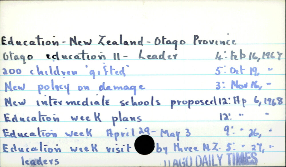Dunedin Public Libraries (4th Oct 2019). Education - New Zealand - Otago Province. In Website Dunedin Public Libraries. Retrieved 27th Mar 2026 18:11, from https://dunedin.recollect.co.nz/nodes/view/127240