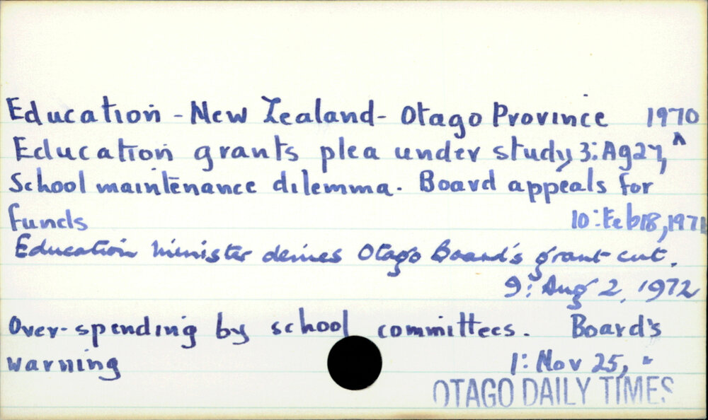 Dunedin Public Libraries (4th Oct 2019). Education - New Zealand - Otago Province. In Website Dunedin Public Libraries. Retrieved 27th Mar 2026 18:12, from https://dunedin.recollect.co.nz/nodes/view/127244
