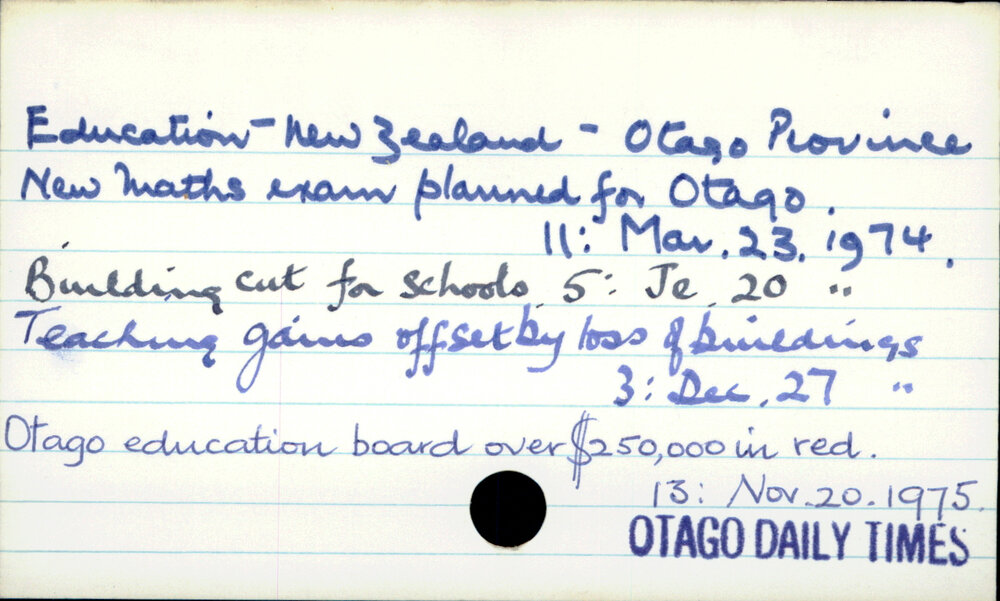 Dunedin Public Libraries (4th Oct 2019). Education - New Zealand - Otago Province. In Website Dunedin Public Libraries. Retrieved 27th Mar 2026 18:12, from https://dunedin.recollect.co.nz/nodes/view/127248